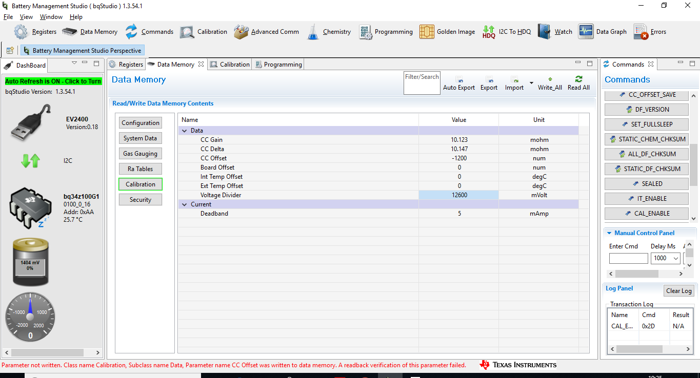 After Connecting the EV2400 and BQ34z100EVM using i2c cable, I clicked on UNSEAL mode to make the device in UNSEAL mode in command window on right side.But I am not able to verify if the same has been implemented as I am not able to change the registers. I am always getting error saying " READ OF DATA WRITTEN FAILED COMPARISON". I am not able to make VOLSEL as 1 to configure it for external battery mode. Can someone please help me with this on how to configure these things and fix asap