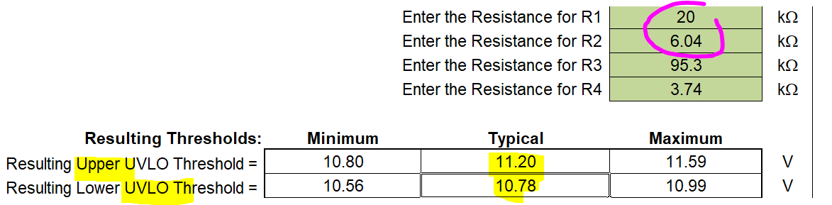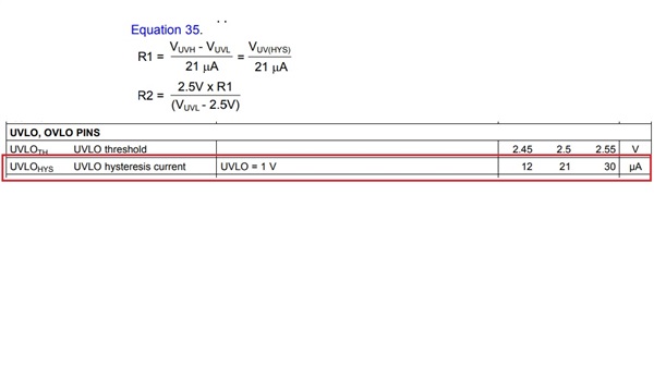 hi , i will calculator UVLO voltage point, but i used equation 35.on the datasheet to calculate 11.4v, but the actual amount of 11.2v is measured,