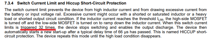 Regarding the detection of Current Limit, in the data sheet "When this switch current limits is triggered 32 times, *******"