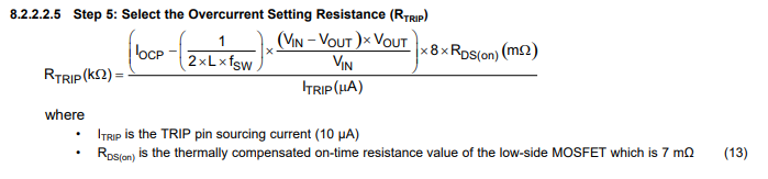 For the application in the datsheet (Vin=12V,Vout=1.5V, Fsw = 500kHz, L=1uH, Iocp = 15A) Rtrip =80.6kΩ.