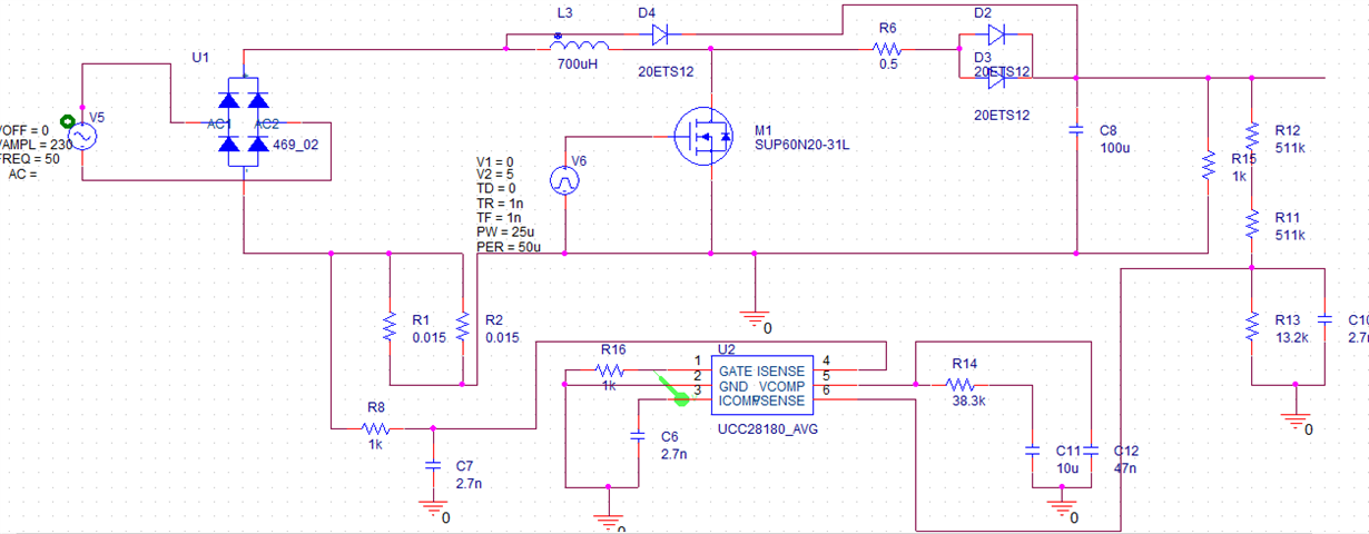Please find PSpice model attached. I am trying to simulate the converter in open loop, with 20kHz frequency to see how the gate signal looks like. I have attached the probed voltage at gate. Please help me understand what may have gone wrong. I have used transient model of UCC28180 obtained from TI.