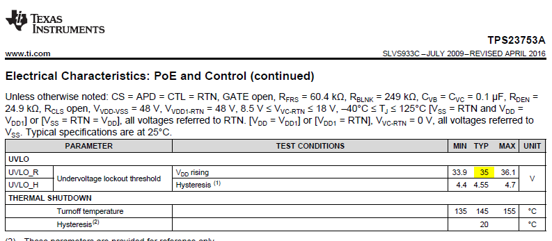 I have a question regarding UVLO definition for the TPS23753A (see attached .png). What exactly means: UVLO typically 35V?