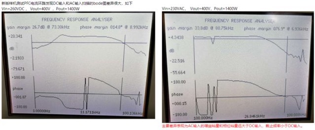 At 1400W power load (still in continuous current mode), the bode plot is quite different with 260VDC input (left in the picture) and 230VAC input(right in the picture).