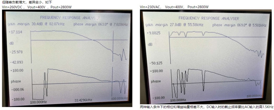 At 2800W power load, there is less difference between the bode plot with 260VDC input (left in the picture) and 230VAC input(right in the picture). Both shows enough margin.