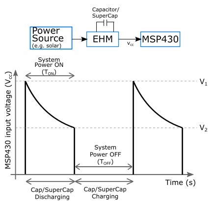 The EHM will be need to setup with a Capacitor / Supercapacitor. The EHM will provide an output to the MSP430, when the supercap reaches a voltage V1, and cut off the power when the supercap is discharged to V2. These thresholds should be something like :