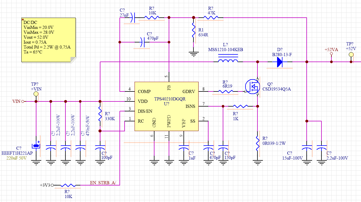 I have done a step-up with a TPS40210DGQR: Vin is 24V nom, and Vout is 52V, 0,75A nom (attached image).