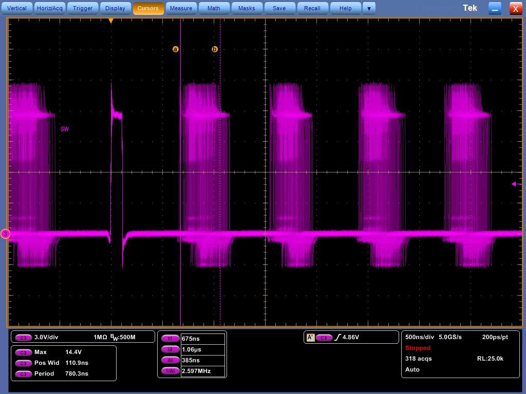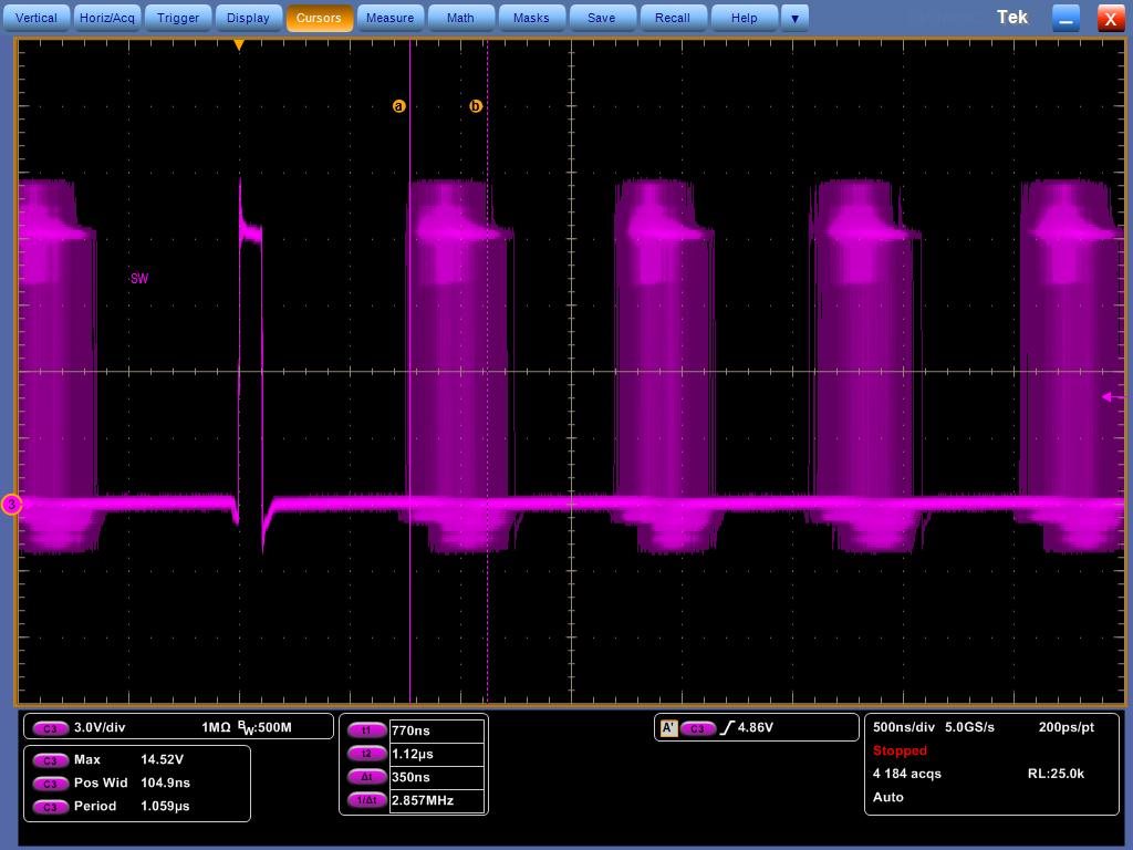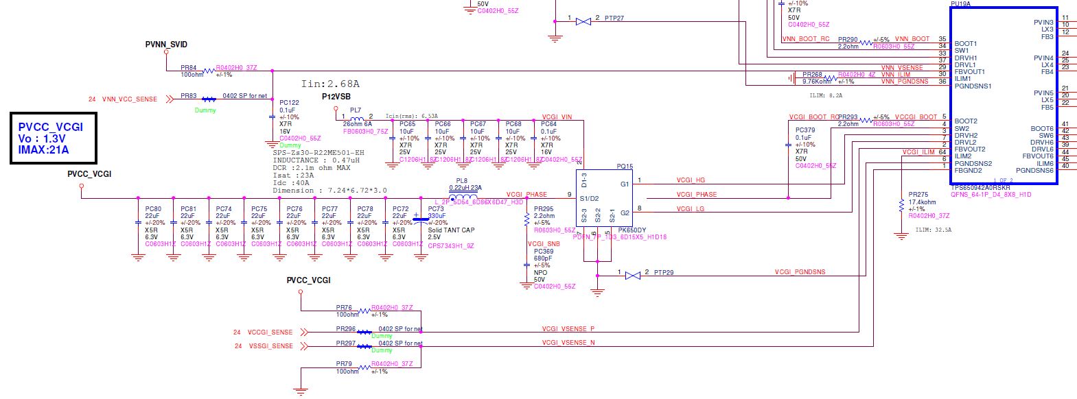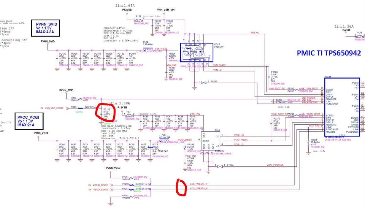 I am Alec Chen form WT and our customer is currently using TPS650942 in their design(please see the schematic as below). And we discover that the Jitter for the Buck 2(VCGI) power rail is over RD's spec (within 25%) . Please also see the Jitter waveform that we measure shown as below. The first one is the 4A load waveform and sec one is the 21A(max load). We check TPS650942's spec and it seems that there are not much that we can change to improve the Jitter . Therefore , Could you kindly give us some advice about improving the Jitter issue? Thanks in advance