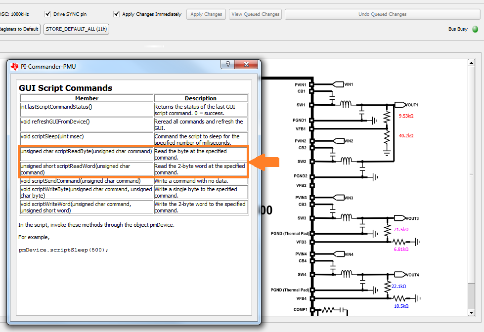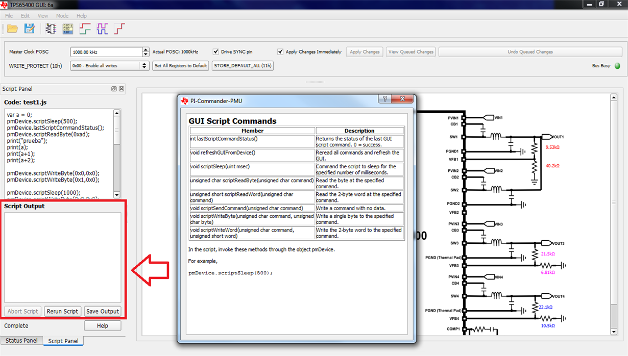I have an Evaluation board for the TPS65400, and I downloaded the PI-Commander-PMU EVM GUI . I have been using it to do some testing but I have notice that there is a Scripting capability but the EVAL BRD datasheet nor the PI-Commander-PMU EVM GUI zip file have examples or guide on how to use this feature.
