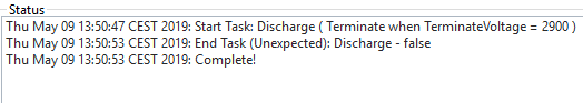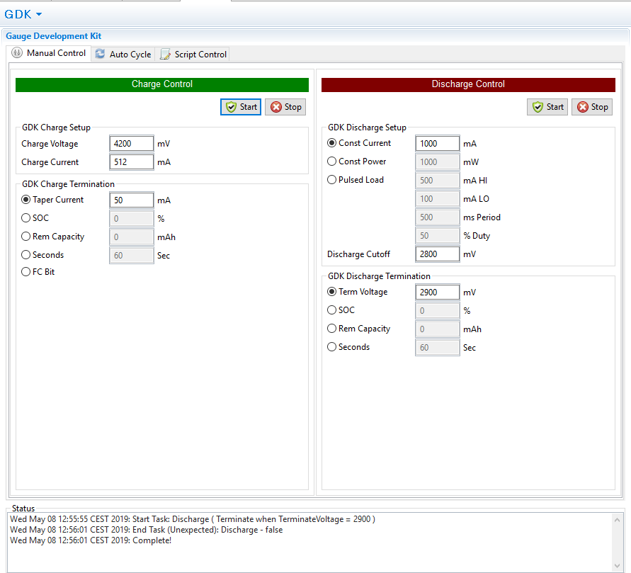 Following Onyx's advise, I press the black reset buttons for the two uC on the board and cycle power to the board. After ensuring both GDK and the gauge are already turned on, I try to discharge the battery by 100mA, 500mA, 1000mA, 1500mA and 1900mA constant current. All of them fail with the same error message as seen pictorially: