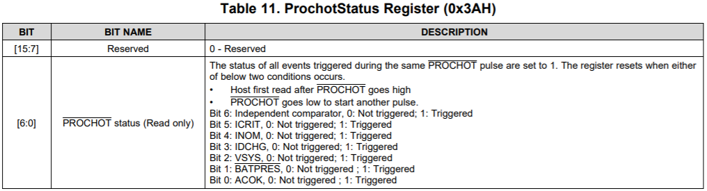 I am trying to understand more in detail about the PROCHOT options in BQ24780S charger . Do the events in the PROCHOT option registers trigger only during Hybrid boost mode or do they trigger for example say In Normal operating condition I enable ACOK in PROCHOT option 1 and when I remove A.C and leave it with battery connected will it still detect the event in PROCHOT status ?