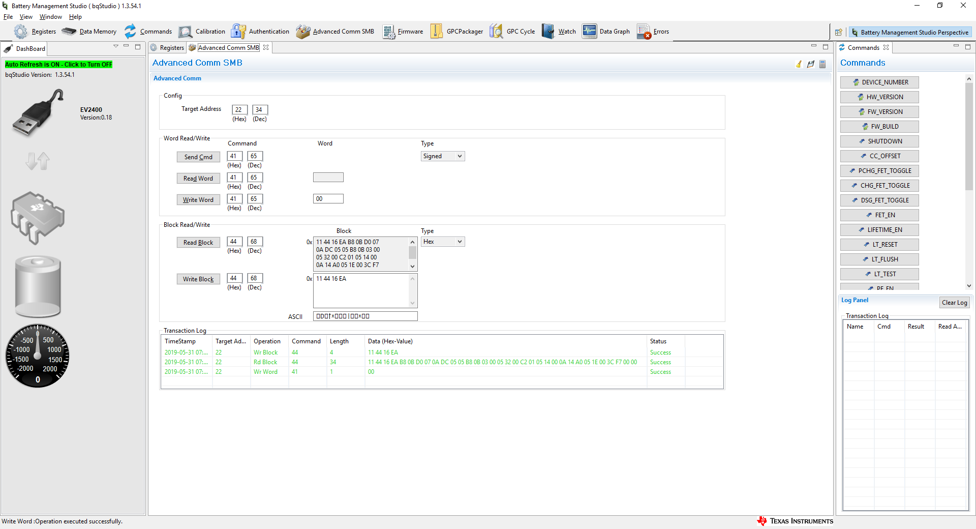The device is no longer able to communicate within the battery management studio. How do I undo this? I'm assuming I have to send a series of commands through the Advanced Comm SMB tab? Can you please outline those commands or provide another solution?