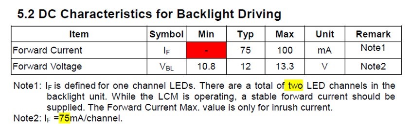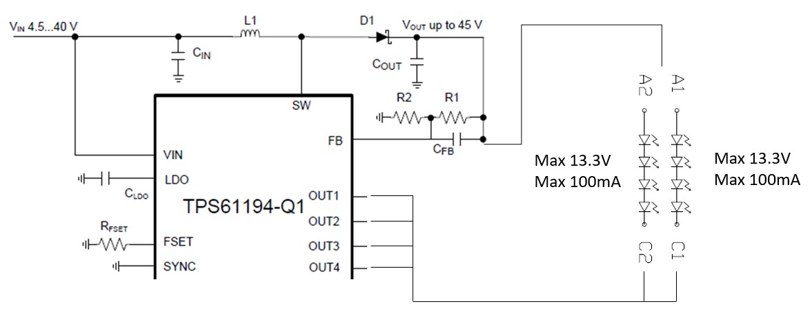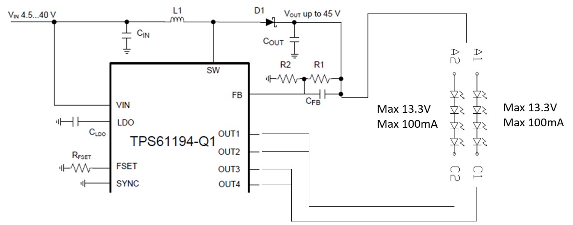 I have a backlight LED with 2 channels, each have 4 LEDs. TPS61194 Vin=5V, the Vou is 13.3V. Below is the backlight LED spec.
