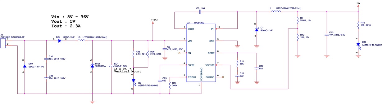 It outputs 5V with TPS54260 and is designed with WEBENCH® designs. Below is the TPS54260 design circuit.
