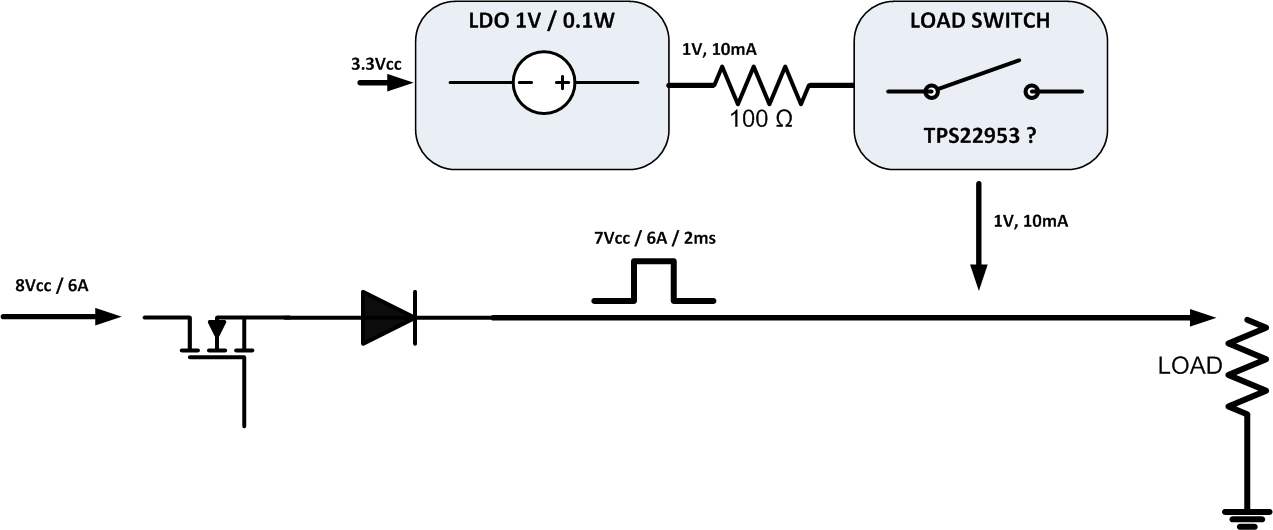 My first idea was to use a load switch with reverse blocking like the TPS22953, but my line voltage is above 6V, and the load switch cannot support more than 6V on the output, so I expect that the TPS may be damaged by the main line voltage on his output. In fact, most of the TI load switch seem to work around 5V, so it's mean that I cannot use a load switch in this case ?
