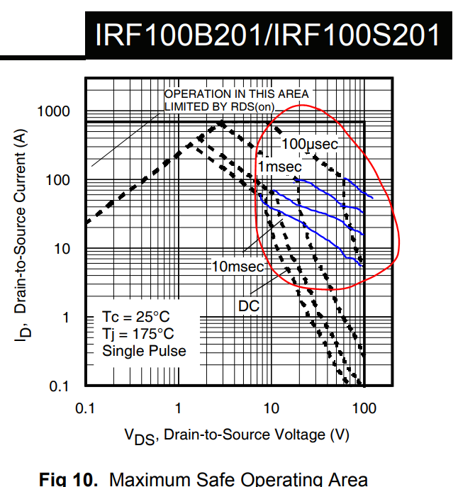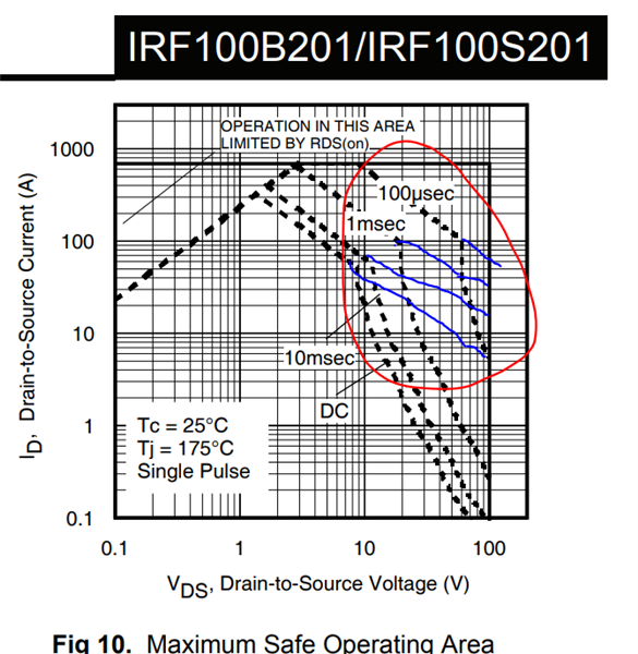 The SOA of IRF100B201 FET is weak, please consider PSMN4R8-100BSE