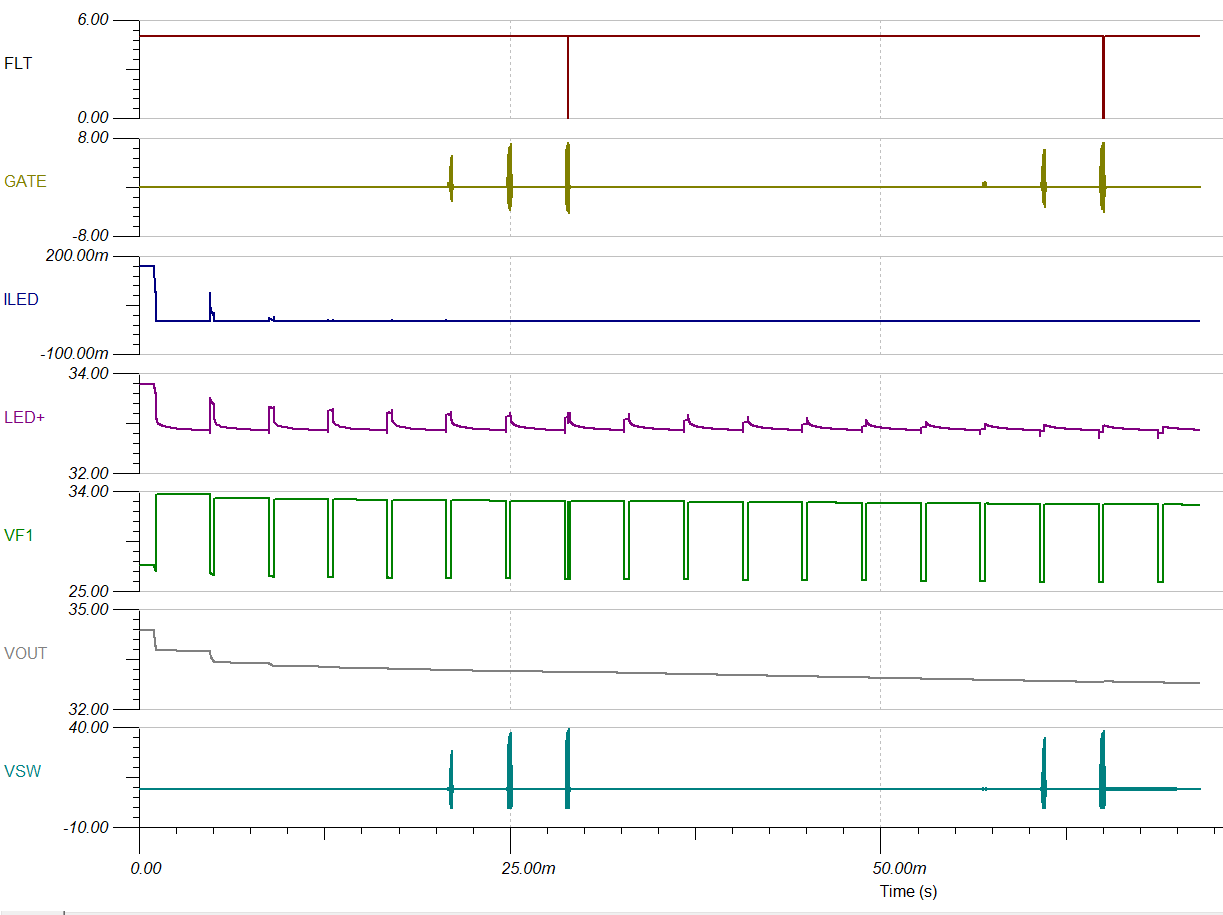 It seems that the boost fet gate drive will only run in short pulses and turn off instead of boosting up to the expected voltage. Also the Fault output seems to trip for very short periods of time.