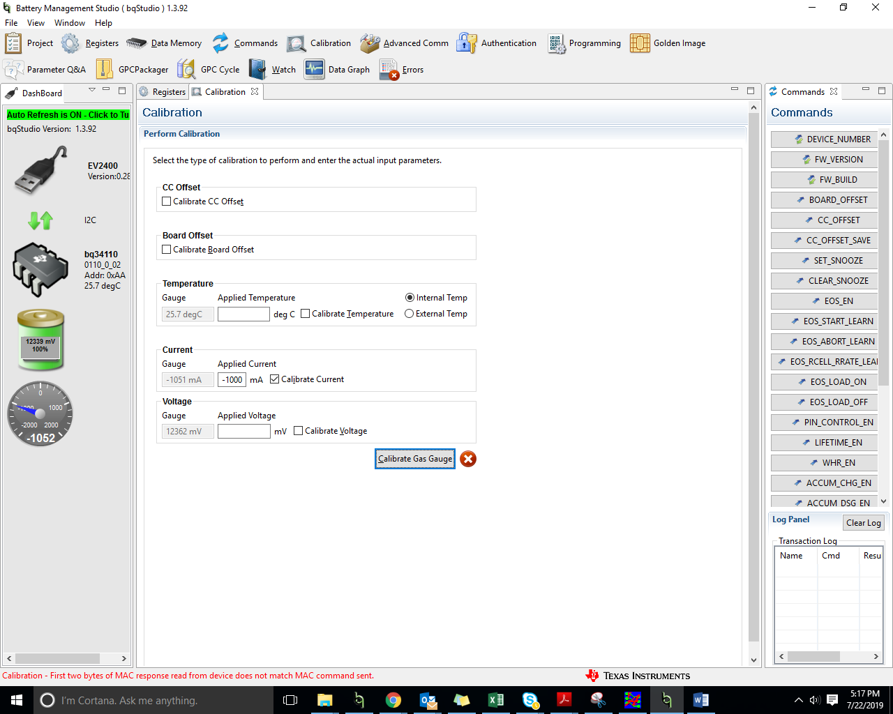 I'm currently having a problem in doing current calibration in bqstudio. An error "first two bytes of the MAC response read from the device does not match MAC command sent." when attempting to calibrate. I already followed recommended solutions in this related inquiry (https://e2e.ti.com/support/power-management/f/196/t/806677?tisearch=e2e-sitesearch&keymatch=BQ34110EVM-796 but the error still persists. Add to that, I'm already using the latest version of bqstudio. Thanks.