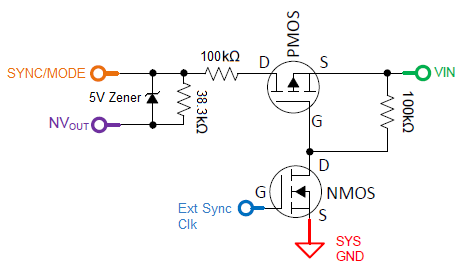 Sync/Mode pull low (Rrt) with 38.3K is set for initial switching frequency at 1MHz.