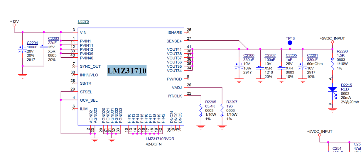 I have this schematics of LMZ31710. I am supplying 12V input and configured to get 5V output. But I am getting 12V at TP43. Ideally I should be getting 5V. Just to understand. If I measure R2295 and R2297, i should read the exact values? On PCB, right now they are giving values of R2295 = 50kOhm and R2297 = 15 Ohm