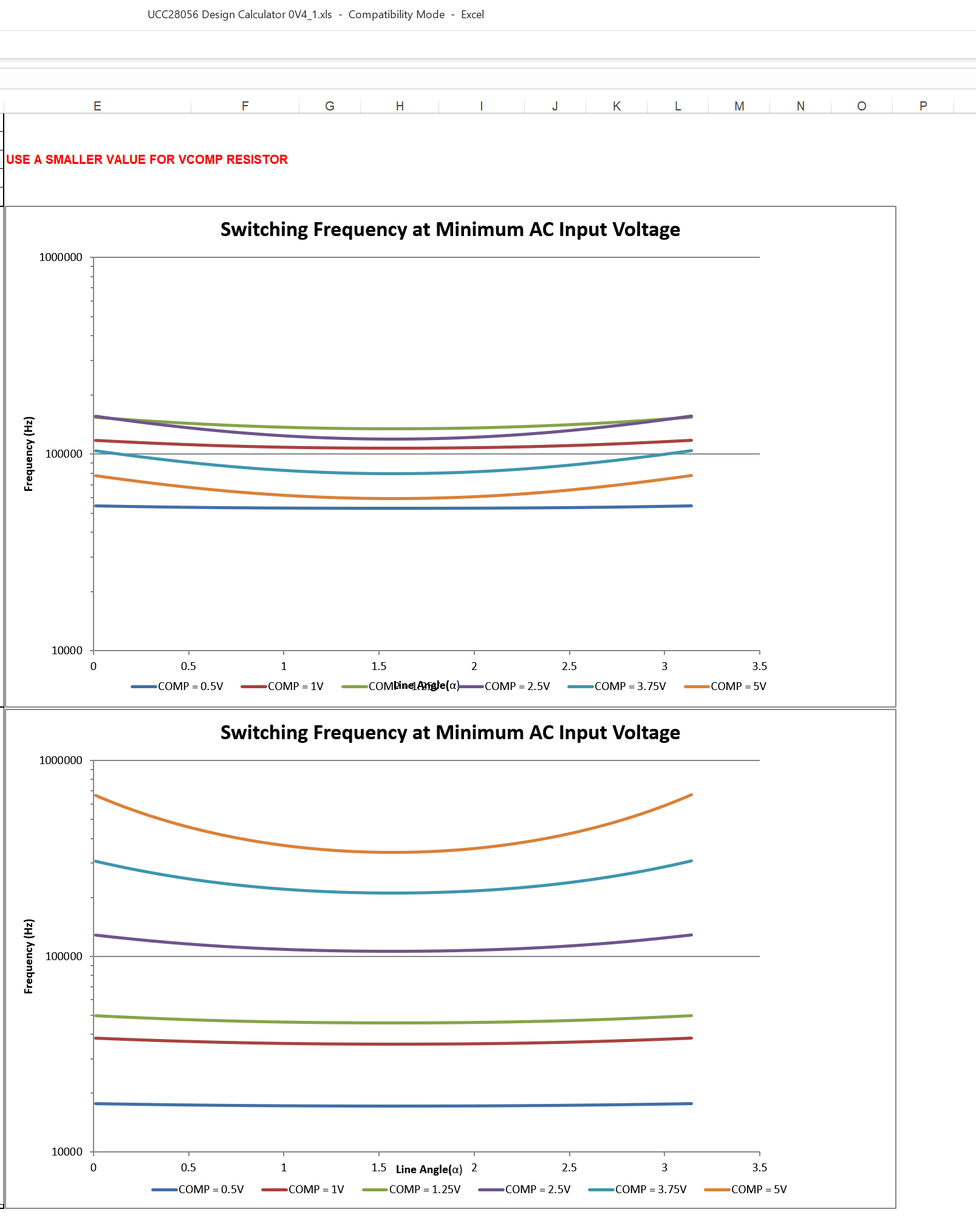 In the UCC28056 design calculator, the switching frequency is plotted for various values of COMP voltage. This information can be utilized to determine an appropriate inductance if a minimum switching frequency requirement for your application.
