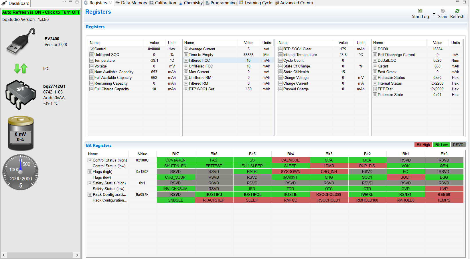 Looks like you have a bad chip. Cell voltage is reading 0. Cell temp is reading -39.1C