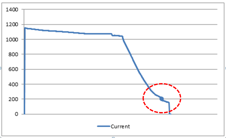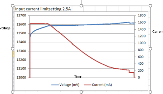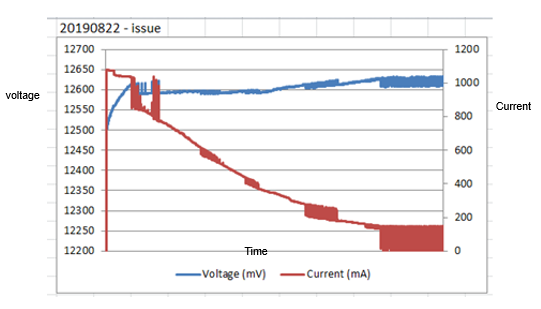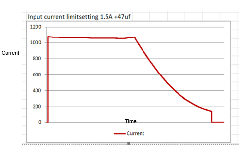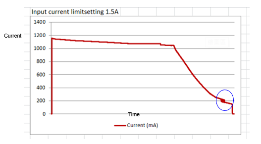Please refer to the attached image. When customers perform a performance testing, they found there is a current oscillated (Red region). After changing the register 0x3F – input current limit from 1500 to 2500mA, this symptom is gone.