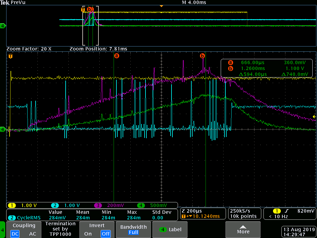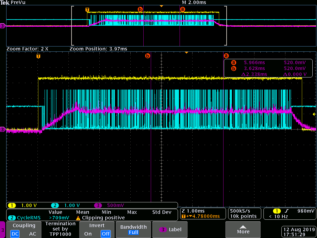 In contrast, “tek00218.png” shows a faster PWM shutdown. It was not able to replicate the same output voltage waveform, but IMON voltage is shown in CH4. The design have an RIMON of 190 kOhm, and reaching a voltage of 1.1V, it results into a current consumption of 40 Amps.