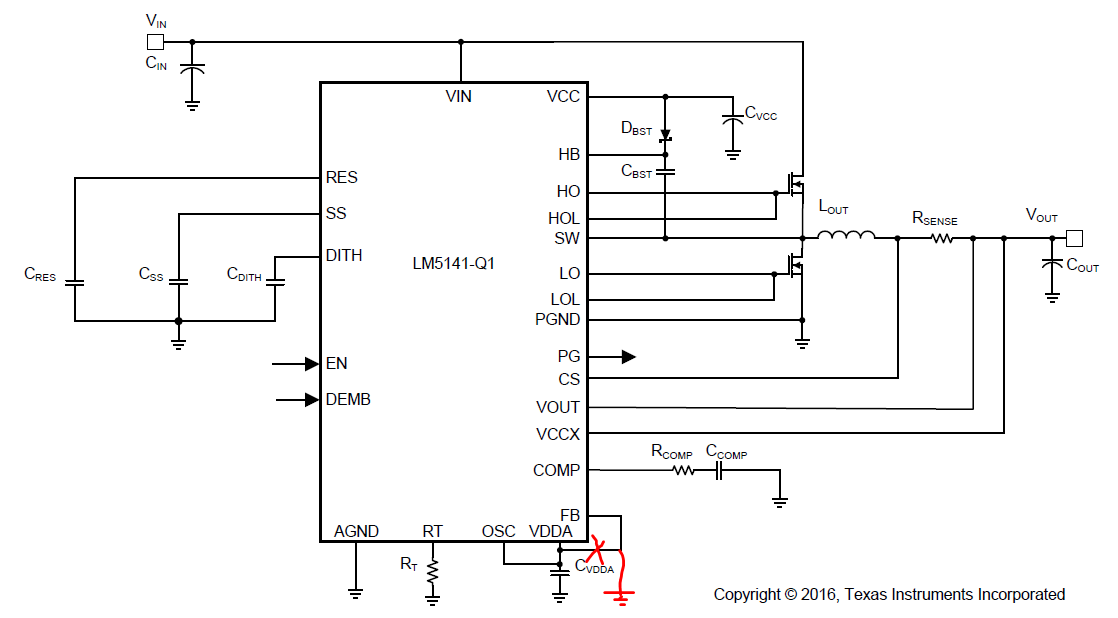 My customer is using LM25141-Q1 for 12V input 5V output with a maximum load of 15A. Schematic is similar to this with L=3.3uH Rsense=0.004ohm Fsw=440K.