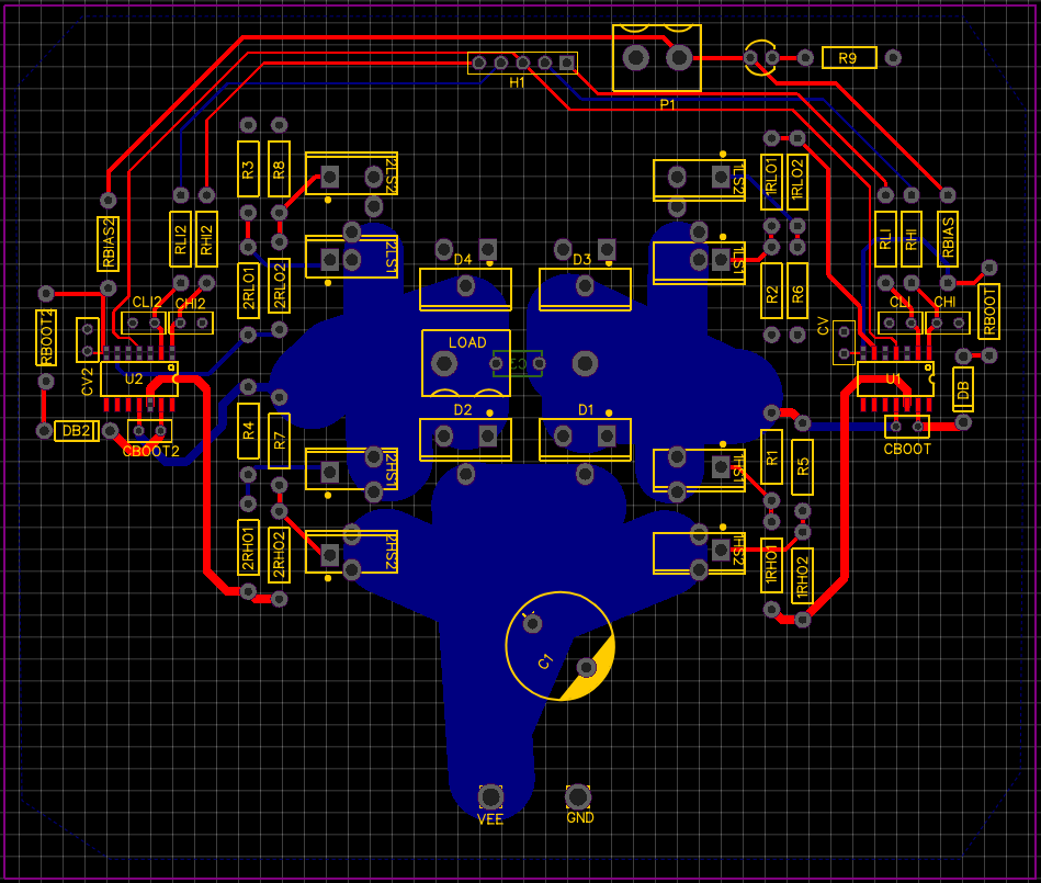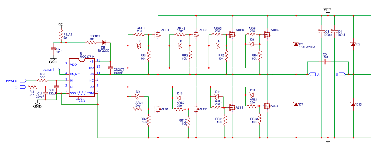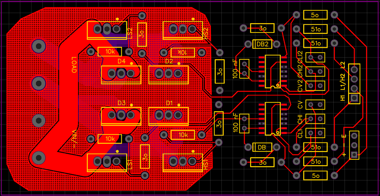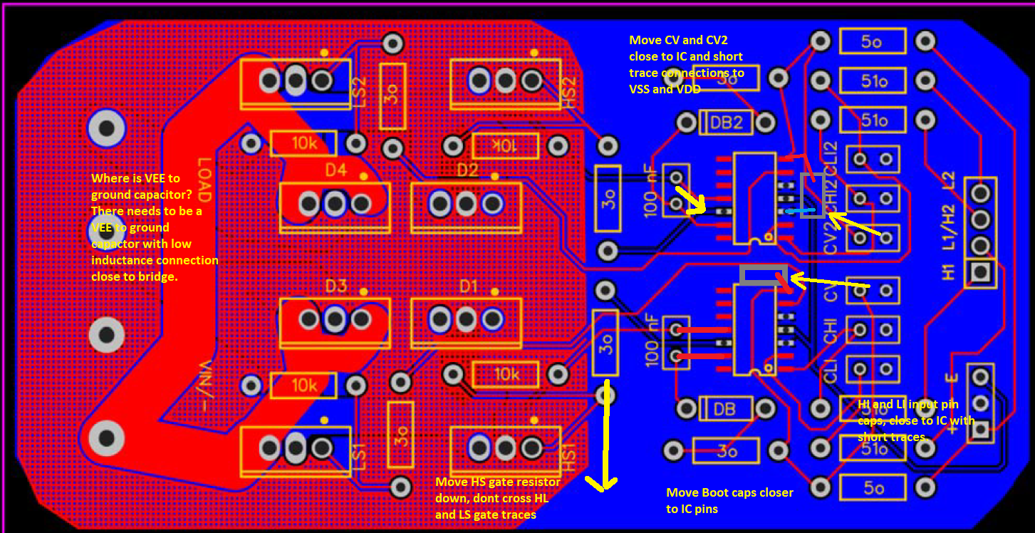 Hello! my name is jesus and recently I have been working on the design of a high current h bridge, I have to say that I am a little novice and would greatly appreciate any help. Make a pcb with the design that I show you here (200v h bridge) with an arduino doing the logic, to generate the pwm and the dir. I don't know what could have happened, since once I connected the bridge and turned on enable the bridge h burned. I also attached the design of the pcb (5x10 cm) and a photo of how the bridge h.
