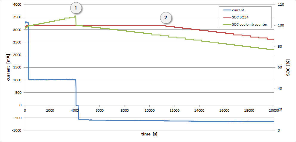 During the charging phase, the charger apply a kind of trickle charge for a copula of hours after the SOC has reached the 100% value. In the following discharge phase I see the SOC level remains at 100% value for a long time (few hours). Such a "latency" in the SOC update during discharge creates a big error in the SOC estimation.