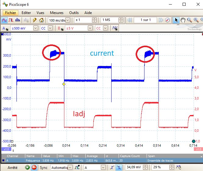 We play with the ADJ pin to programm either 1.2 or 2.2A.
