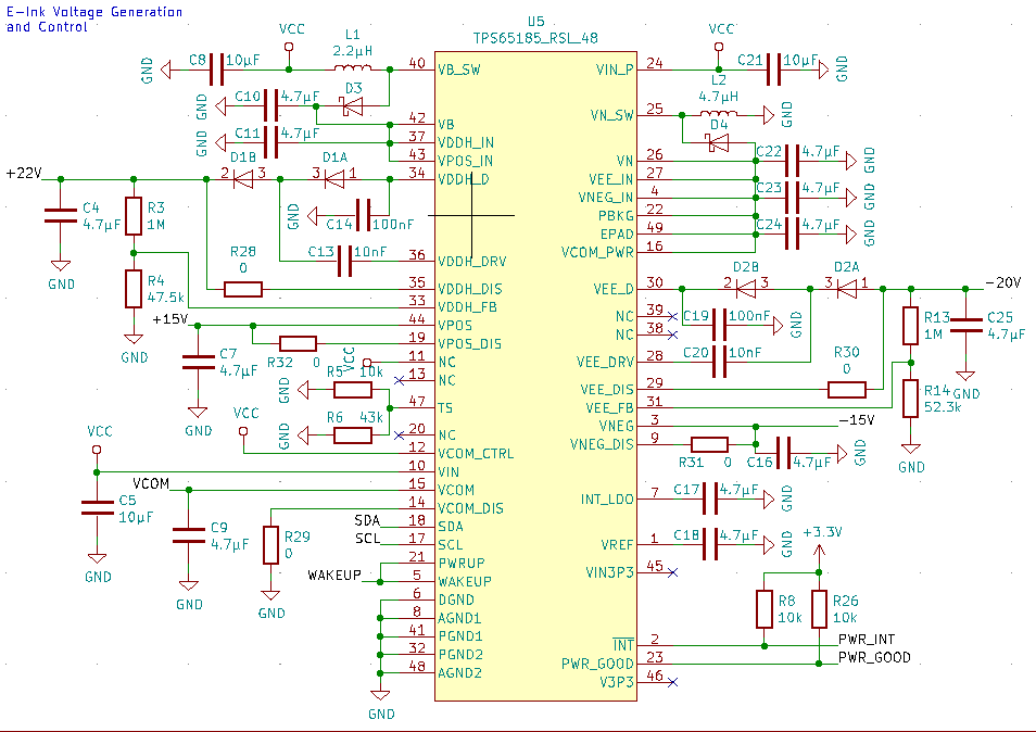 I am currently prototyping with the TPS651851 that I am controlling with an ESP32 and I am unable to communicate with the chip over I2C. I have a board built and I am able to communicate with the other I2C chips, but the TPS651851 does not respond to any I2C communication. Since it is a prototype, I realized that I had made a few mistakes with my design initially, so I have a few bodge wires, but testing with a voltmeter and scope it seems like at the very least I should have all the power and communication lines working correctly. I am planning on getting another board built soon to fix my known issues, but since I have not been able to test the TPS651851 I am worried that the new design wouldn't work either. The schematic that I am currently using for the chip is this: