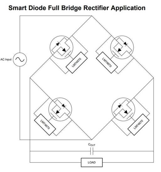 LM74670-Q1 turns-On the MOSFET when drop across body diode of the MOSFET increses above 0.48V. SO the the drop across any branch of the rectifier will not increase beyond 0.48V and then MOSFET would turn ON. Please see section 8.1.2.3 and 7.4.2 in the datasheet.