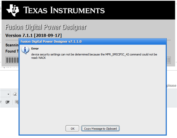I connect USB adapter to my board and use TI Fusion tool to scan PMBus devices.It shows below error message as title.