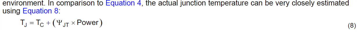 Due to the fact that 60%-95% of heat is convected and radiated off the PCB rather than the case, equation 4 below gives false junction temperature. However, equation 4 is straightforward and widely-used in the industry. Therefore, I think the basic idea of ψJT is that it enables people to reuse the equation that they are familiar with to calculate junction temperature from IC case temperature and provides a more accurate estimation of Tj.