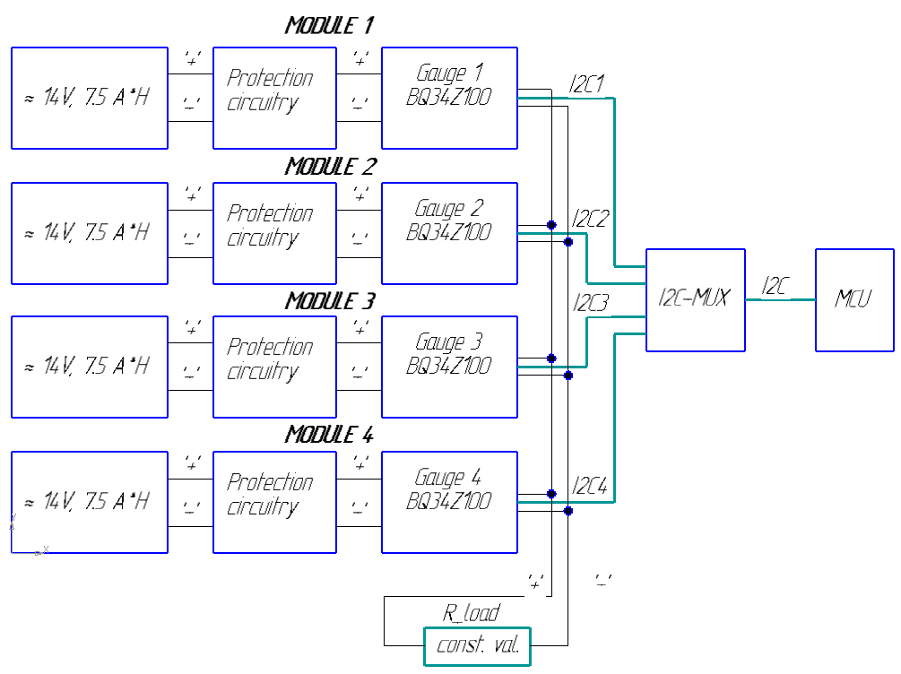 Each module has BQ34Z100-Z1 gauge (to obtain state-of-health (SOH) from module; number of modules in design may change from 1 to 4 items) so, MCU collects data from four gauges.