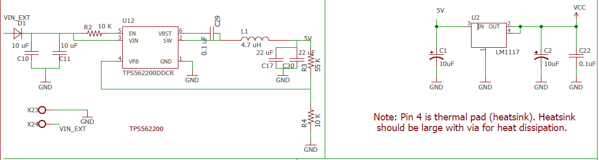 I am using TPS562200 to convert 12 V to 5V output. At the output of 5V ,I have connected LM1117 to further convert 5V to 3.3 V. I have observed that there is random drop in 5V and 3.3 V level which causes my micro-controller to reset. However on experimentation of putting 330 uF Aluminium Electrolytic Capacitor on 5V and 3.3 V, uC does not resets and it works fine. What can be the reason behind this behavior? Kindly let me know if more information is required. I have attached schematic below