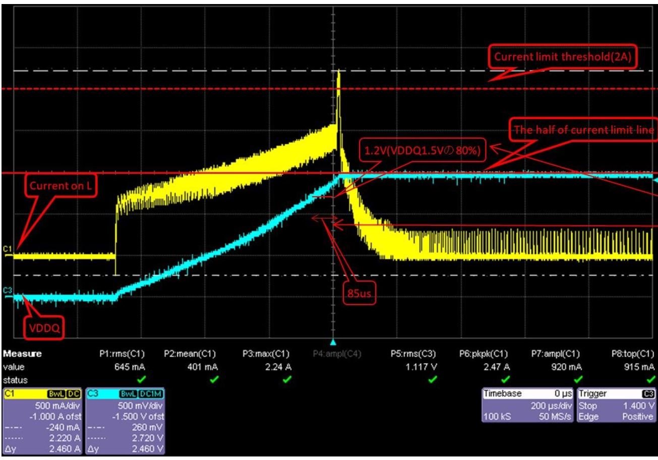 > 650 mV (87% of its target value) and the overcurrent threshold is set