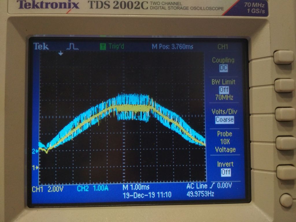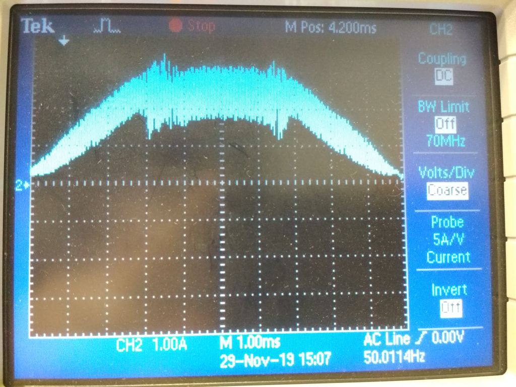 The circuit design works perfectly with loads up to 400Watts however in the 500-600Watt load range the AC line current becomes non-sinusoidal.