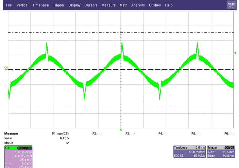 At a load of 600Watts the simulation indicates that the voltage on Pin2 reaches its maximum limit and results in clipping of the sinusoidal waveform at the peak exactly where the inconsistent switching duty cycle is occurring in my prototype circuit.