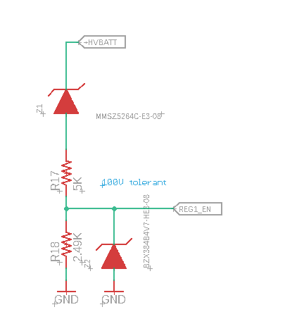 Next, we have some circuitry connected to the REG1_EN signal to enable or disable the device. There is a battery pack which when inserted provides up to 80V so this dropped and ultimately limited to 4.7V with a Zener.