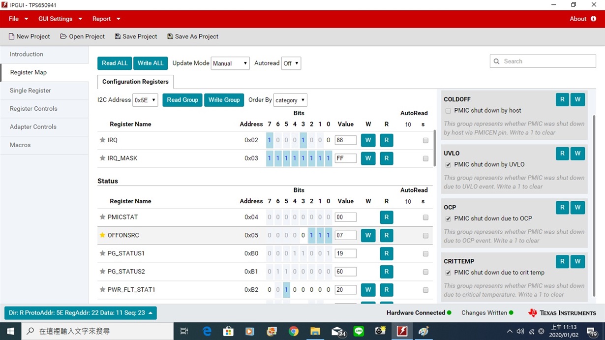 My target board APL, ATX power PMIC Ti TPS650942 follow power on sequence ATX5VSB>dc to dc>VSYS(6V)>LDO5V>V5ANA>PMICEN>RSMRST VNN, V1P8A,V1P24A Vin 5Vdual use USB2ANY read out the register. PMIC shut down by UVLO,OCP measure the V1P8A wave form as follow power up moment seems V1P8A shut down and retry but few ms. V1P8A steady state is stable i attached IPGUI project file could you make a diagnostic which one cause this