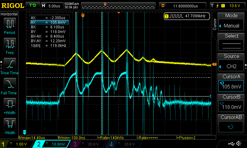 The problem that I've come across is that the converter produces some output that is not really what I would expect - it is clearly visible in the output that the frequency at the inductor is much different from the design point (524,55 kHz) (the smaller ripples that come just behind the 3 main ones are at almost the right frequency). The result is that the output current capacity is limited to around 1.5 Amps and beyond that point the voltage significantly drops.