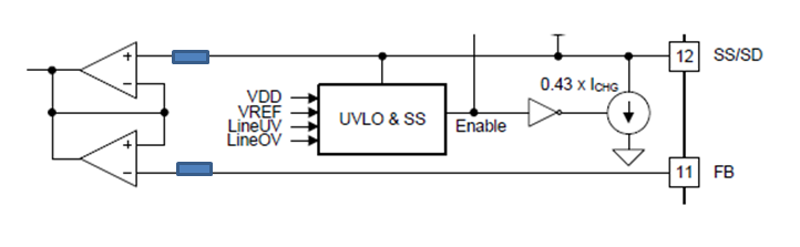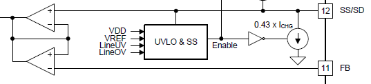 The simplified block schematic is intended to show that the output of the opamps is which ever is the lower value of FB or SS/SD pins.