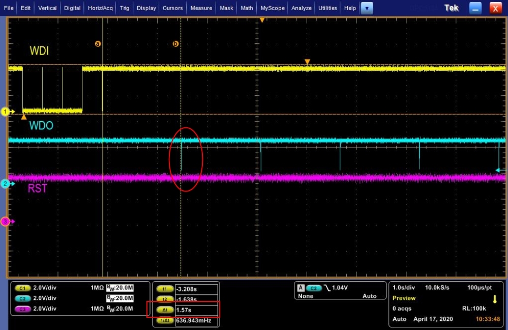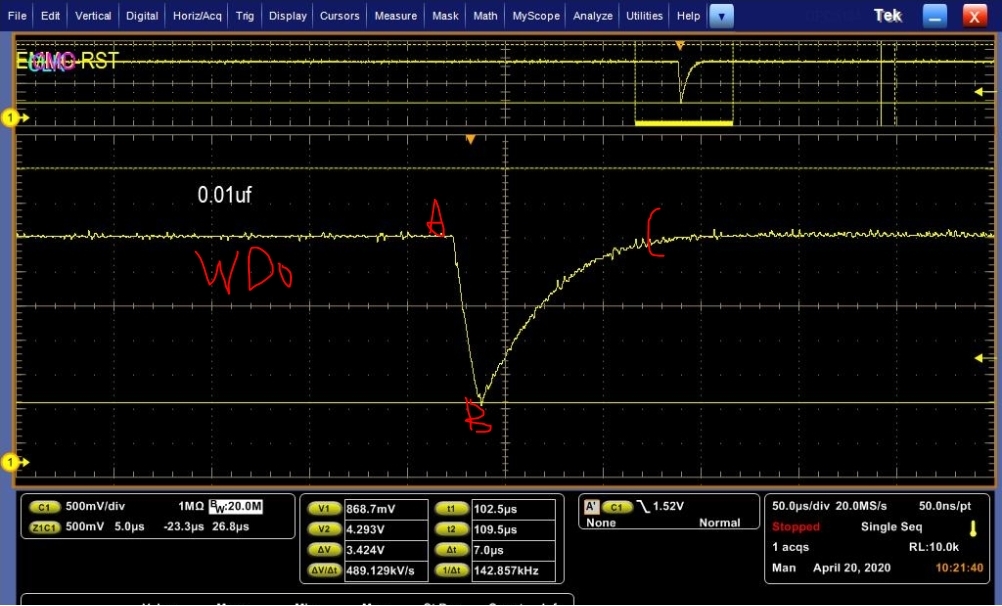 However, in this issue with 0.1uF, we saw something interesting. WDO couldn't go low enough to MR threshold, and it was pulled up after a short time. We don't know how it be pulled up, as no WDI signal(always pulled high in last figure) and it couldn't be the internal 14kohm pull-up resister of MR.