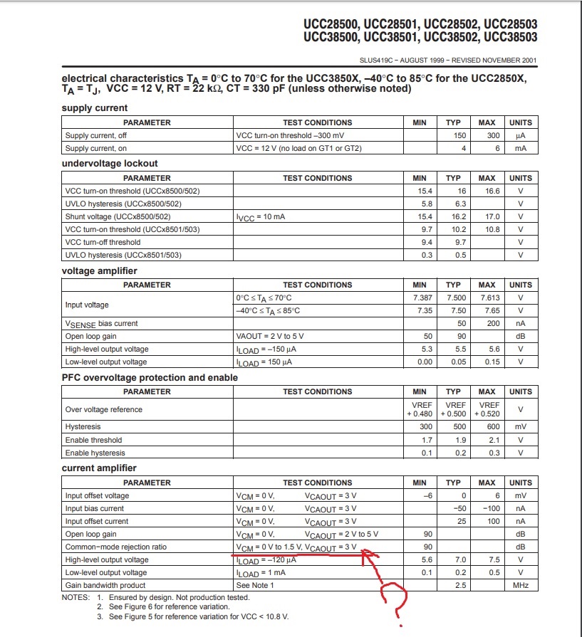Hi! I can’t understand what mode of CMRR measurement of current amplifier in UCC28500 is based on datasheet slus419c p3, CMRR measurement test. It is necessary to short the pins ISENSE1 and MOUT, apply common-mode voltage from 0 volts to 1.5 volts and watch the voltage deviation on CAOUT, is that so? Then what does Vcaout = 3V mean in test condition, is it necessary to force 3 volts to the output of CAOUT? When applying common-mode voltage, the output will be 0 volts, where does 3 volt come from? And by what formula is CMRR calculated?