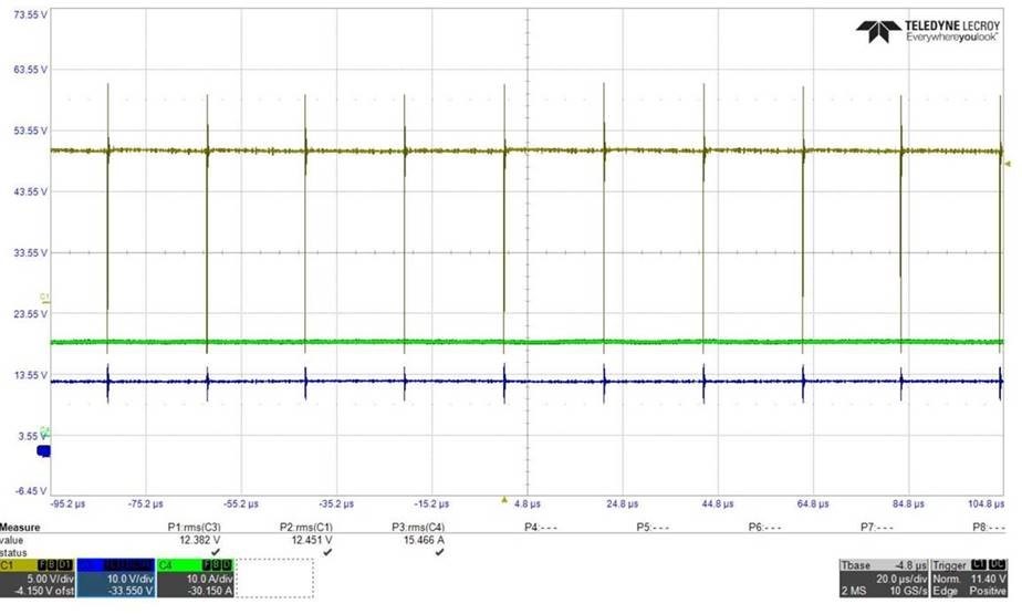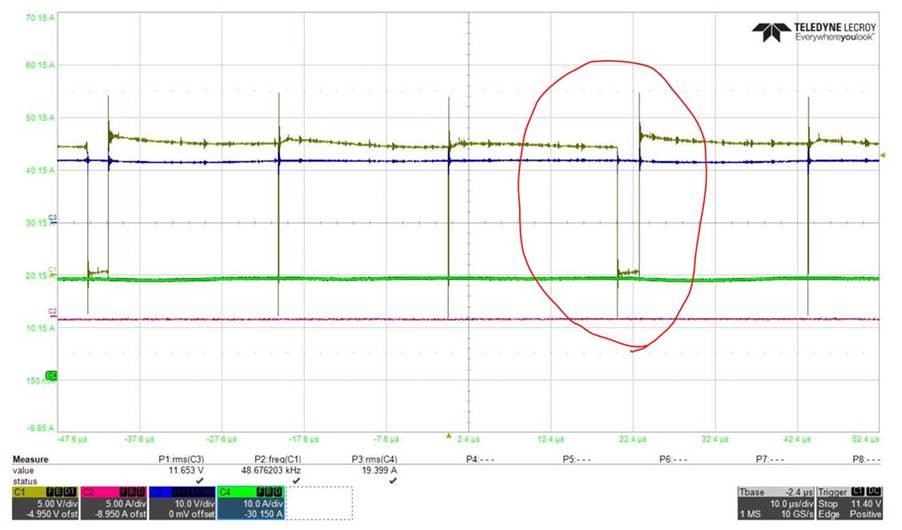 When CC mode test, We control Iout load from 0A~21A. It Hear audible noise at 17A load and drop Vout from 12.6V to 10V. And it happen switching lose as below 2nd capture.