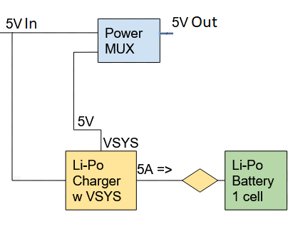 I want to make simple schematic, where a battery charger connected to the 5V bus. It should work like an UPS, I need 3A from charger back to 5V bus.