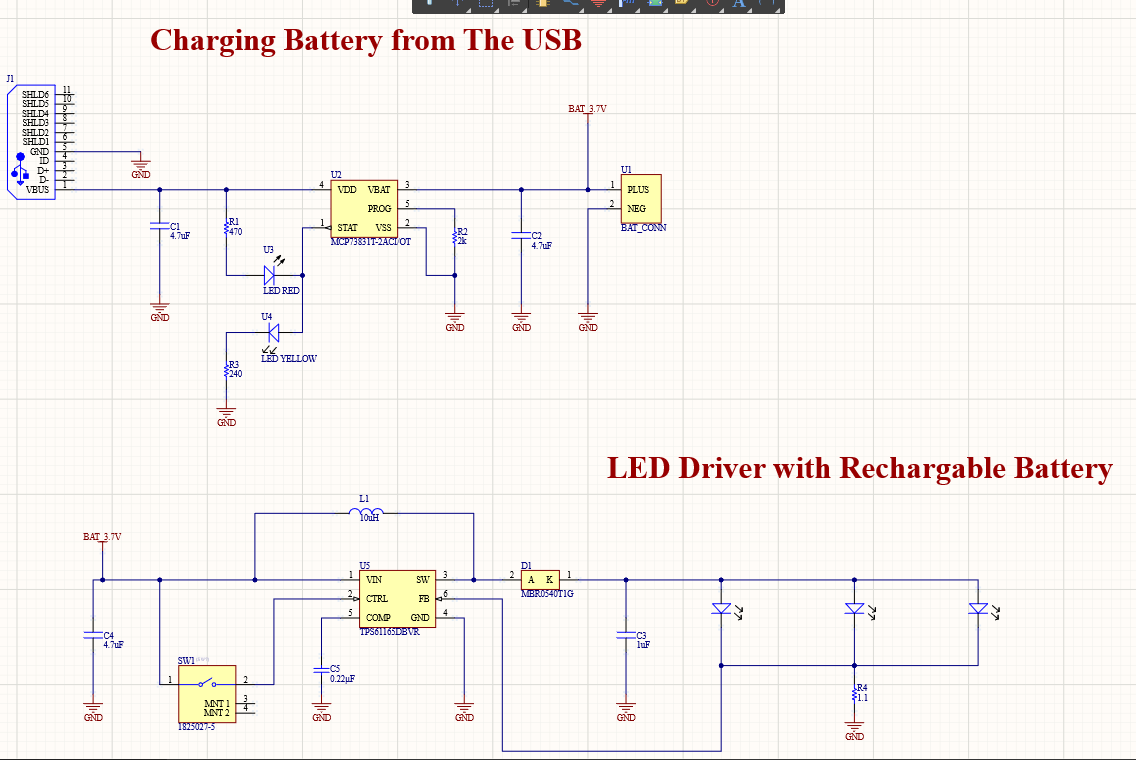 I want to design a led driver system with a rechargable battery (3.7V) powered with USB chargable. The led driver system was designed with TPS61165DBVR, and I plan to use 5-7V forward voltage and 20mA forward current LEDs. I placed a tactile spst switch on the power line and the led driver will operate when I press the button. My question is that is the design true for driving these type of leds?