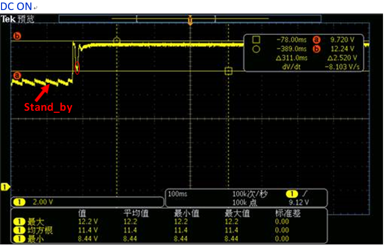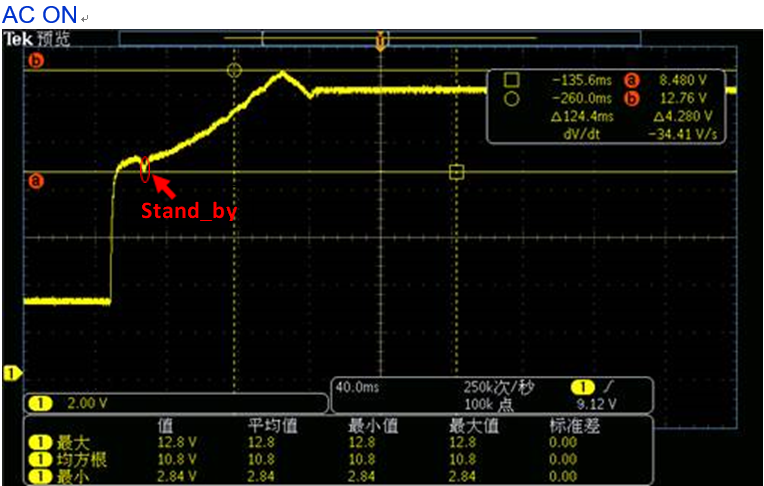 Due to the power up loading has the sequence, so the ACDC side will has the drop voltage behavior on as waveform showed during ACDC change from standby power to 12V.